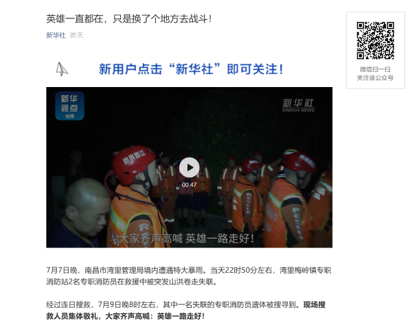 7月7日晚,湾里梅岭森林公园附近公路,暴雨倾盆,50余辆轿车、货车、油罐车,180余名群众因暴雨和交通事故被堵在环山公路,2名司机被困在左边是山壁、右边是水流湍急的河流,路面严重积水的地方。湾里梅岭镇专职消防站专职消防员徐济鑫在开展交通事故救援时,与同事张五洲一道被突发山洪卷走,牺牲在救援第一线。