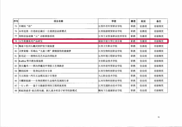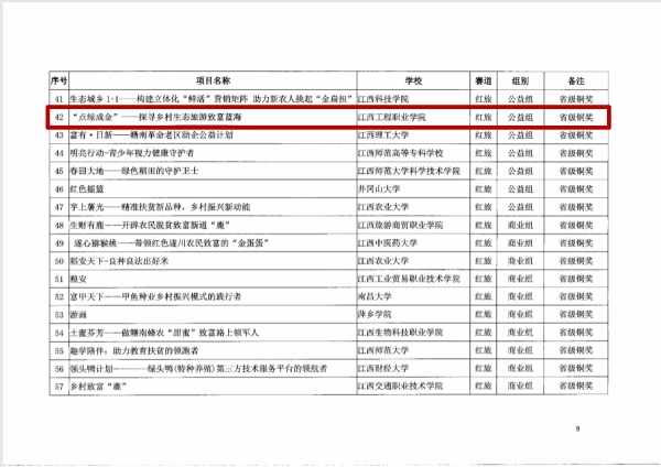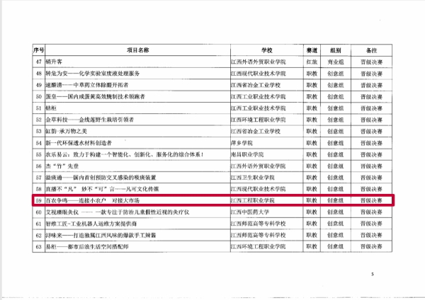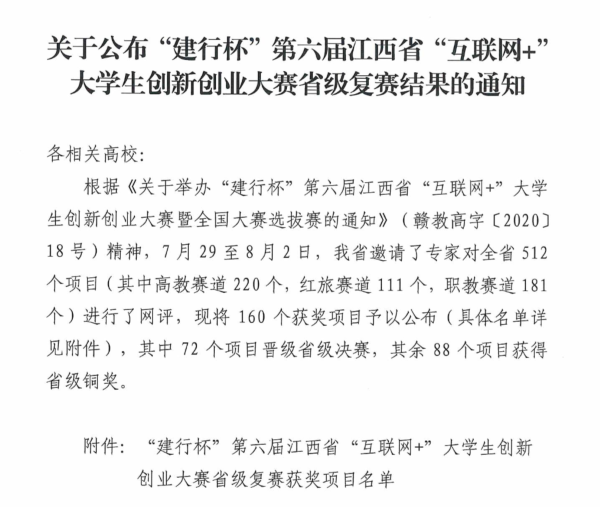 8月5日,江西省高等院校毕业生就业工作办公室下发《关于公布“建行杯”第六届江西省“互联网+”大学生创新创业大赛省级复赛结果的通知》,beat365由新余电大选送的“玉竹果脯系列产品研发”项目和由高职学院选送的“‘点绿成金’——探寻乡村生态旅游致富蓝海”项目分别获得职教赛道和红旅赛道省级铜奖,由高职学院选送的“百农争鸣——连接小农户 对接大市场”项目晋级全国决赛。