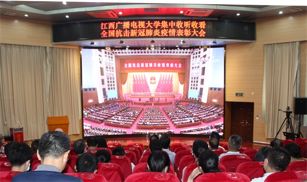 9月8日上午,江西广播电视大学全体教职员工分别在青山湖校区和抚河校区集中收听收看全国抗击新冠肺炎疫情表彰大会。
