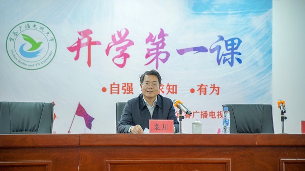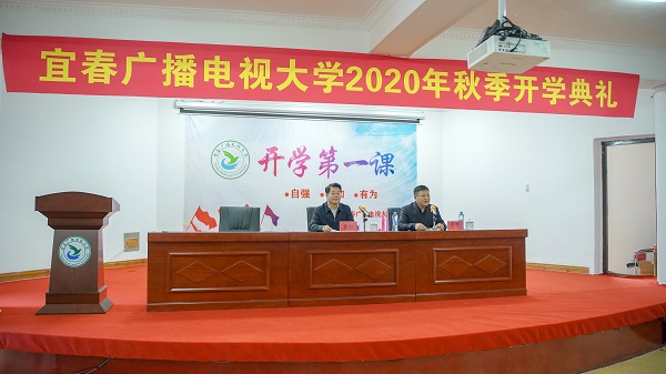 10月17号上午,宜春广播电视大学2020年秋季学期开学典礼在学术报告厅隆重举行。学校特邀中共宜春市委常委、市委宣传部部长袁川为师生讲授“开学第一课”,讲座由宜春广播电视大学党委书记罗咏主持,全体教职工及200余名新老生代表现场聆听授课。宜春市教体局党委书记、局长袁志平,秘书科科长邓俊能,推进办主任曾泉根,市委宣传部教育和未成科科长袁智勇列席。