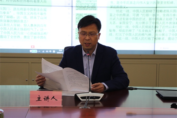 党委委员、副校长邱东升领学习近平总书记在纪念中国人民志愿军抗美援朝出国作战70周年大会上的重要讲话精神,并以《抗美援朝战争是伟大战争》为题,围绕决策英明、胜利伟大、意义深远三个方面作纪念中国人民志愿军抗美援朝出国作战70周年主题宣讲。主题宣讲准备充分、史料详实、思路清晰、主题突出,对全体领导干部进一步理解和弘扬伟大的抗美援朝精神具有很好的促进作用。