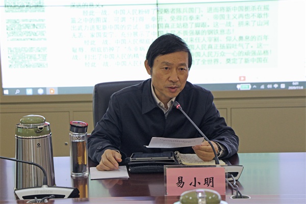 易小明指出,在中国人民志愿军抗美援朝出国作战70周年之际,我们要更加缅怀在伟大的抗美援朝战争中牺牲宝贵生命的先烈,更加铭记中国人民志愿军在抗美援朝、保家卫国的革命事业中建立的丰功伟绩。要以发展的思路、长远的眼光审视历史、观察现实、思考未来,更好地汲取历史经验,从中获得现实的、长远的教育,凝聚起实现中华民族伟大复兴的强大力量。让我们更加紧密地团结在以习近平同志为核心的党中央周围,为实现中华民族伟大复兴的中国梦而拼搏奋斗,为推进学校各项事业发展不懈努力。