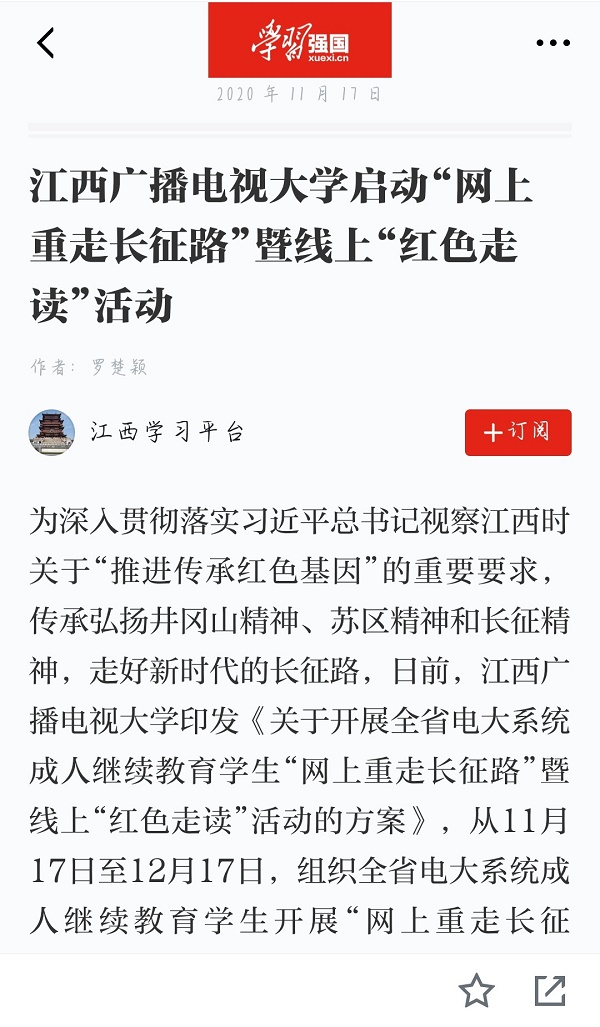 为深入贯彻落实习近平总书记视察江西时关于“推进传承红色基因”的重要要求,传承弘扬井冈山精神、苏区精神和长征精神,走好新时代的长征路,从11月17日至12月17日,江西广播电视大学组织全省电大系统成人继续教育学生开展“网上重走长征路”暨线上“红色走读”活动,以实际行动迎接建党100周年。活动的开展引发了各界关注。