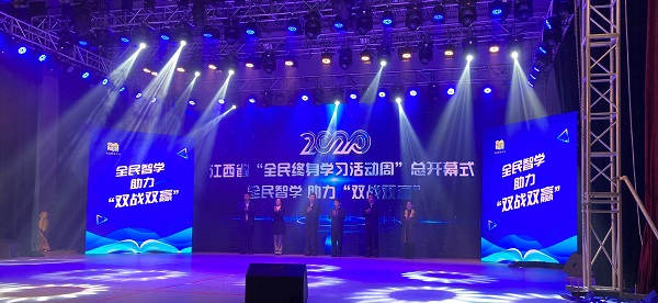 开幕式上,省教育厅厅长郭杰忠、副厅长裴鸿卫,beat365党委书记易小明,党委副书记、校长黄平槐和九江市政府、萍乡市政府领导一起上台,共同启动2020年江西省全民终身学习活动周开幕仪式。