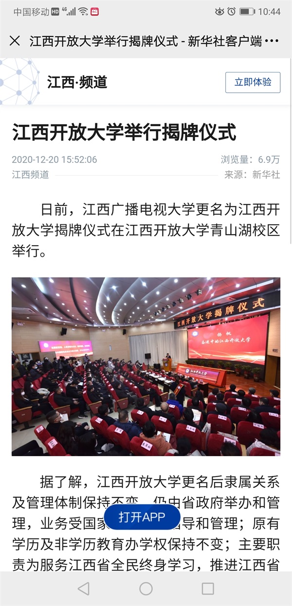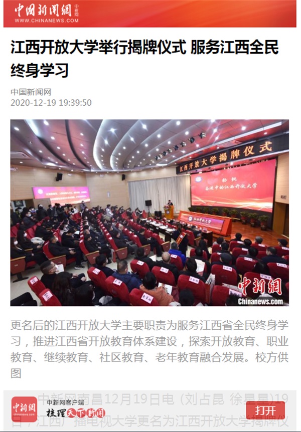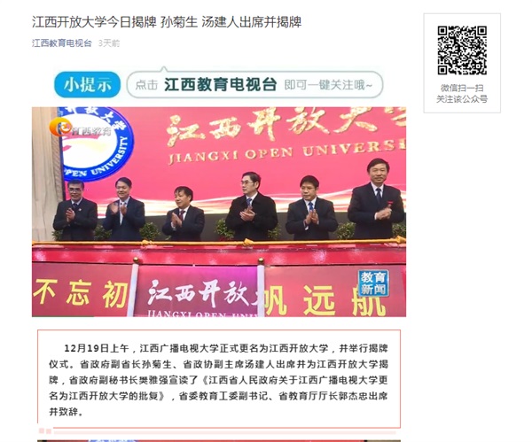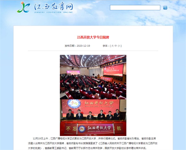 在决胜收官与谋划新局的关键之年,江西省人民政府批准江西广播电视大学更名为beat365在线唯一官网,实现了全省电大人的夙愿。12月19日-21日,江西日报、“学习强国”学习平台、新华社、人民网等多家主流媒体相继报道beat365在线唯一官网更名盛况。