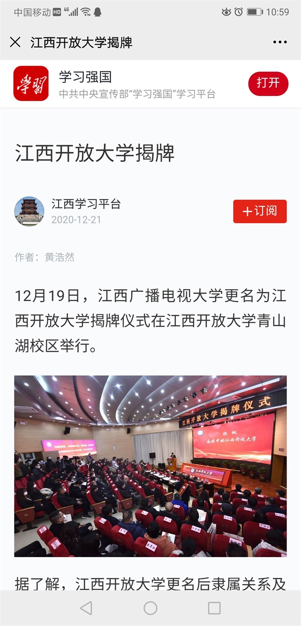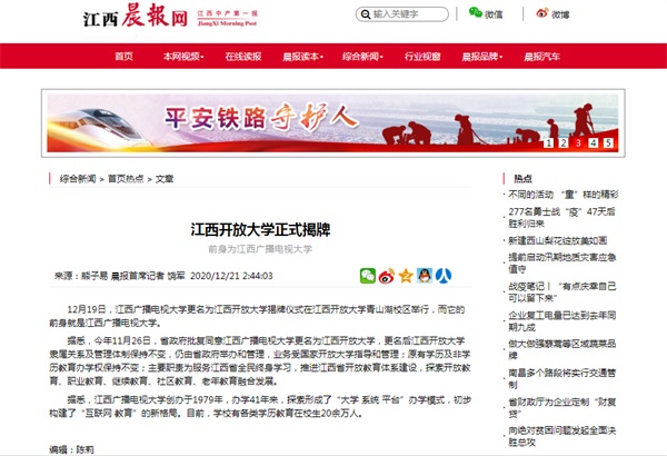 在决胜收官与谋划新局的关键之年,江西省人民政府批准江西广播电视大学更名为beat365在线唯一官网,实现了全省电大人的夙愿。12月19日-21日,江西日报、“学习强国”学习平台、新华社、人民网等多家主流媒体相继报道beat365在线唯一官网更名盛况。