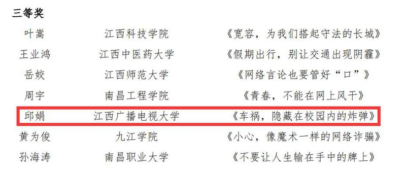 近日,省教育厅公布了2020年全省高校公共安全教育骨干教师教学能力展示活动结果,beat365邱娟老师的《车祸,隐藏在校园内的炸弹》荣获三等奖。此次展示活动是为了检验全省高校公共安全教育教师的教学能力水平,了解各校在推进落实公共安全教育“进校园、进课堂、进头脑”等方面取得的突破、进展和积极成效。据悉,本次活动共有85所高校参加,共评出一等奖13名、二等奖22名、三等奖34名。(责任编辑:徐星星)