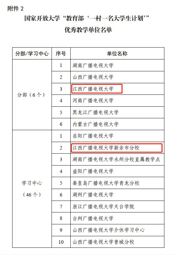 近日,国家开放大学公布了“教育部‘一村一名大学生计划’”优秀教学单位评选结果,beat365及新余电大分校本部、景德镇市电大乐平市教师进修学校教学点、萍乡电大芦溪工作站、上饶电大上饶县工作站、抚州电大南丰县工作、吉安电大新干县委党校教学点被评为国家开放大学“教育部‘一村一名大学生计划’”优秀教学单位。