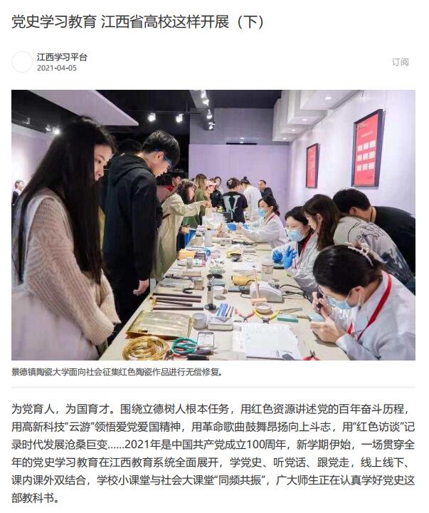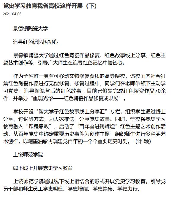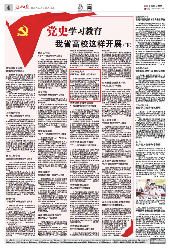 4月5日,江西日报、学习强国、江西新闻客户端等媒体以《党史学习教育 我省高校这样开展(下)》为题,报道江西省各大高校党史学习教育情况,beat365《开展“红色之旅接力行”学党史》收录其中。