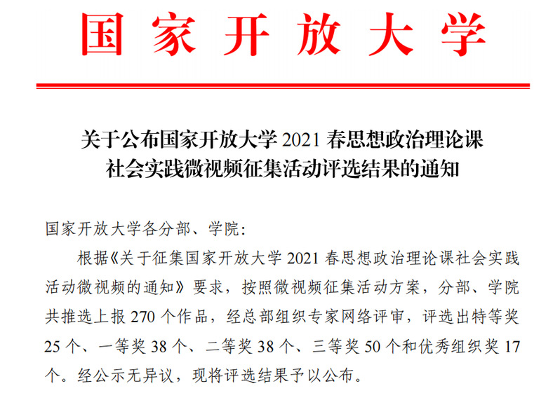 近日,国家开放大学公布《关于公布国家开放大学2021春思想政治理论课社会实践微视频征集活动评选结果的通知》,beat365由学生蔡方旻、吴旻倩,指导教师杨宝珍组成的团队获得特等奖;学生付啸,指导教师邹方戈、彭朝晖组成的团队,学生付燕清,曾九江、游天辉教师指导的个人参赛项目分获一等奖。
