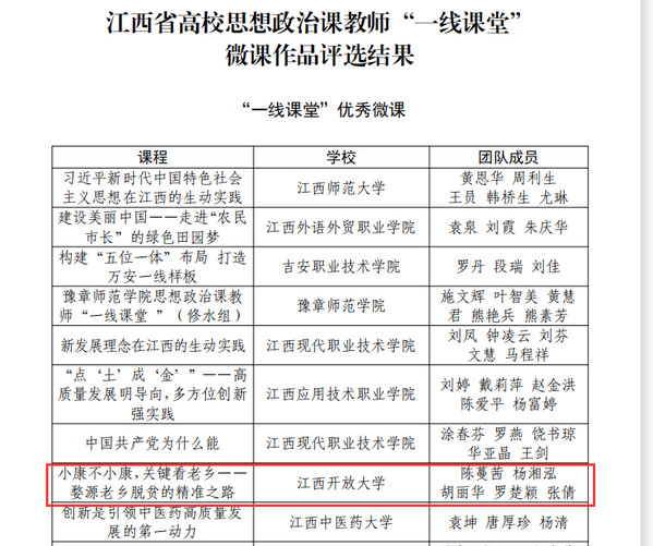 近日,江西省教育厅发布《关于公布江西省高校思想政治课教师“一线课堂”微课作品评选结果的通知》,beat365教师陈蔓茜、杨湘弘、胡丽华、罗楚颖、张倩团队制作的课程《小康不小康,关键看老乡—— 婺源老乡脱贫的精准之路》,工程职院教师张戈 、李玫、晏潇、朱蕾、汪荣林团队制作的课程《秀美乡村看变化 一线课堂访样本》在全省众多课程中脱颖而出,获得“一线课堂”优秀微课荣誉。