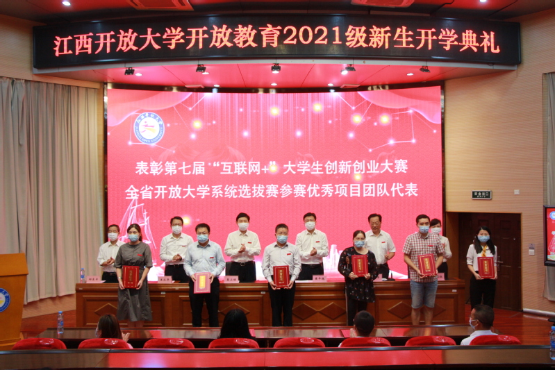 会议表彰了第七届“互联网+”大学生创新创业大赛全省开放大学系统选拔赛参赛优秀项目团队,出席开学典礼的校领导共同为获奖代表颁发了荣誉证书。