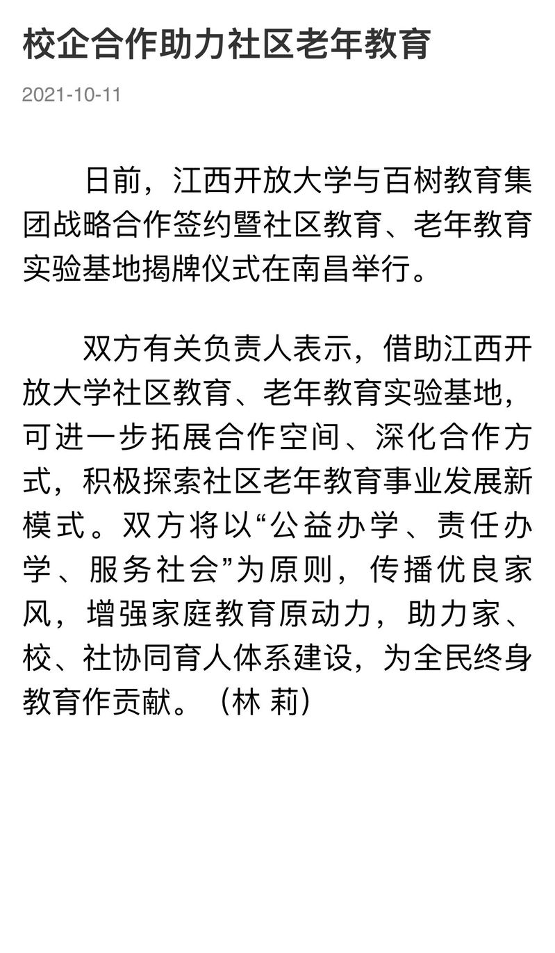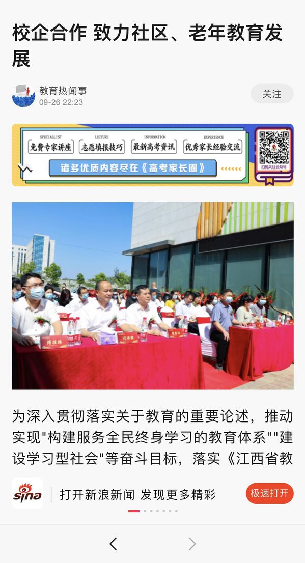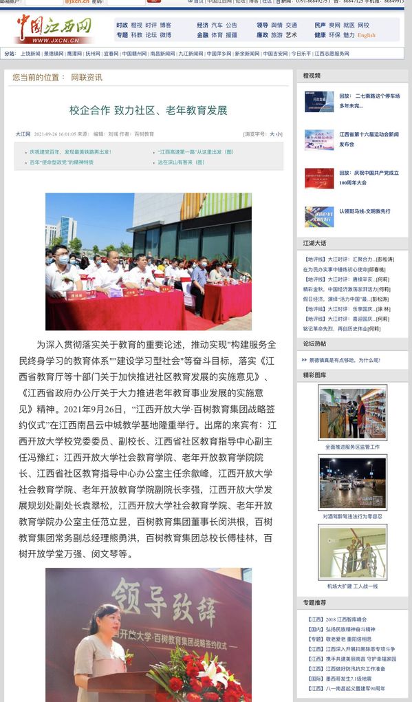 日前,beat365在线唯一官网与百树教育集团战略合作签约暨社区教育、老年教育实验基地揭牌仪式在南昌举行。江西日报、大江网、江西新闻等多家媒体报道beat365以校企合作助推社区老年教育。
