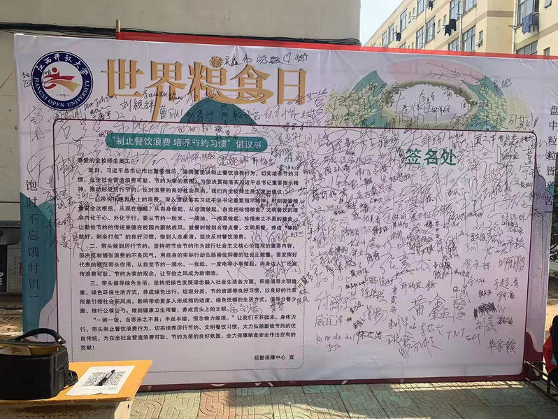 临近午餐时间点,志愿者们又前往食堂,开展制止餐饮浪费宣传活动。青云谱校区食堂门口,张承良、杨柳以及学院师生代表纷纷在倡议书上签名,承诺切实践行“光盘行动从我做起”的倡议。学生食堂内还开展了“光盘换勺”活动,以此引导学生养成节约粮食的生活习惯。