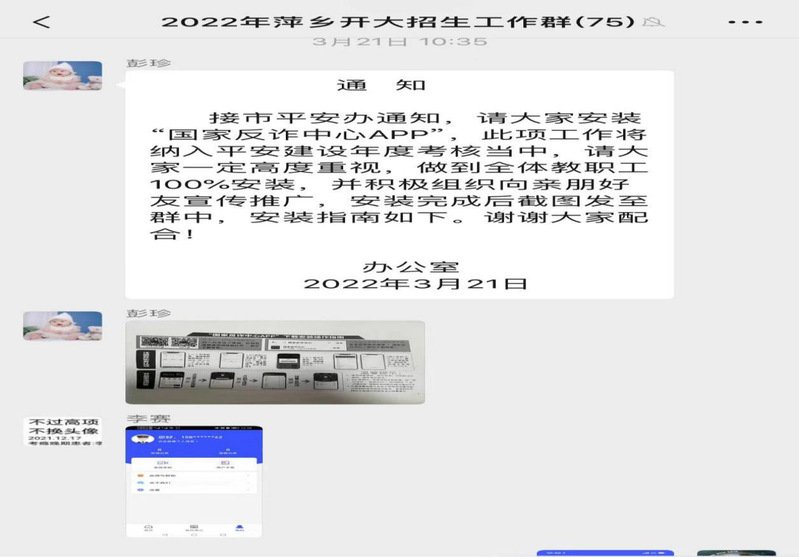 组织全体师生下载国家反诈APP,进一步提高反诈意识和自我防护能力;注重法治宣传氛围营造,增强师生法治观念,形成自觉学法守法用法的良好氛围。
