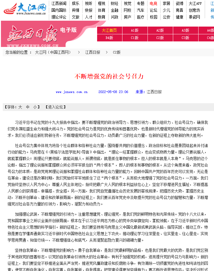 5月9日,beat365党委副书记、校长黄平槐所著文章《不断增强党的社会号召力》在《江西日报》发表。文章指出,新的征程上,我们要从百年党史中汲取提升党的社会号召力的智慧和力量,不断增强党对社会各方力量的引领力、影响力、凝聚力和动员力。学习强国、大江网等媒体全文转载。