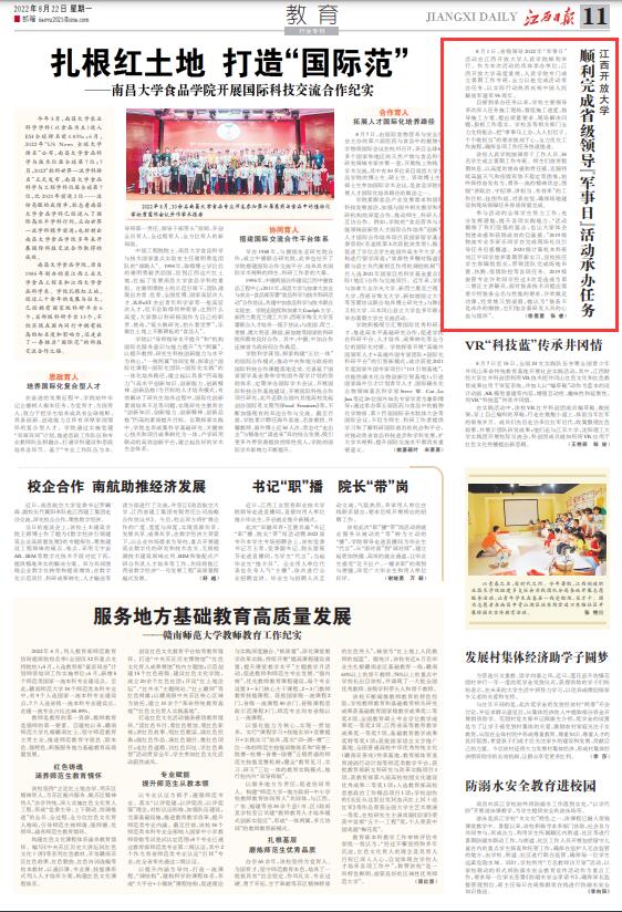 8月1日,在中国人民解放军建军95周年之际,省级领导2022年“军事日”活动在beat365在线唯一官网人武学院顺利举行。作为具体承办单位,beat365在线唯一官网高度重视,领导以上率下、周密部署,师生齐心协力、全力以赴做好各项承办工作。活动圆满结束后,学校相关部门持续关注,追踪并报道活动背后的故事,展示学校师生敢于担当、积极向上的精神风貌,进一步扩大影响力。8月22日,《江西日报》教育版对此进行专题报道。