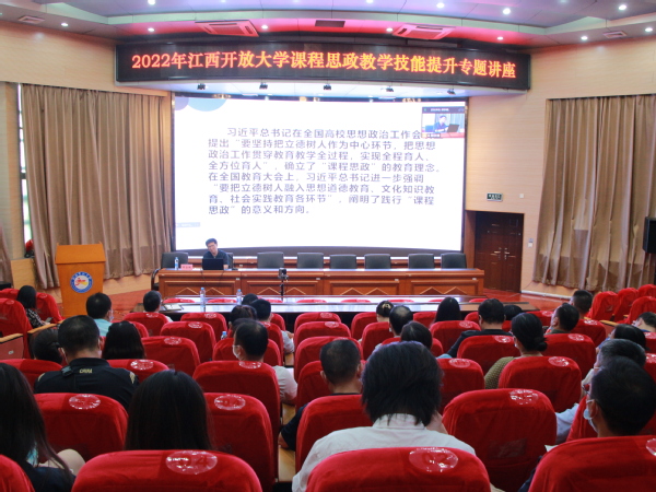 为进一步提升全省开放大学系统教师课程思政建设意识与能力,引导教师更好地结合不同课程特点,运用多种思维方法和价值理念,深入挖掘课程思政元素,更好地推动专业教育与思政教育深度融合,9月30日下午,学校教务处特邀江西农业大学人文与公共管理学院邵宗健副教授来校做题为“他山之石、可以攻玉——内功+外力,提升课程思政教学水平”的专题讲座。本次讲座在青山湖校区设线下主会场,同步开启腾讯会议直播,全省开放大学系统100余名教师通过线上线下方式聆听了讲座。
