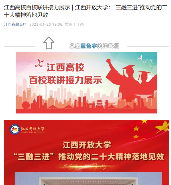 为深入贯彻落实党的二十大精神,学校党委整体规划、统筹推进,制定了宣传教育活动方案,成立了党的二十大精神“三融三进”宣讲团,辐射带动全省开放大学系统师生近18万人学习贯彻党的二十大精神。近日,江西新闻、国际在线等媒体对beat365“三融三进”推动党的二十大精神落地见效进行了报道。