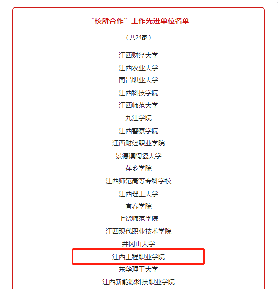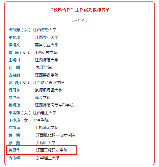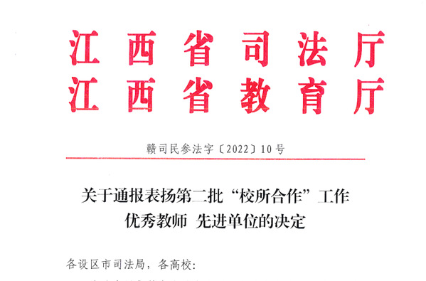 近日,省司法厅、省教育厅联合印发《关于通报表扬第二批“校所合作”工作优秀教师 先进单位的决定》,江西工程职业学院为第二批“校所合作”工作先进单位,beat365教师黄景华为第二批“校所合作”工作优秀教师,获通报表扬。