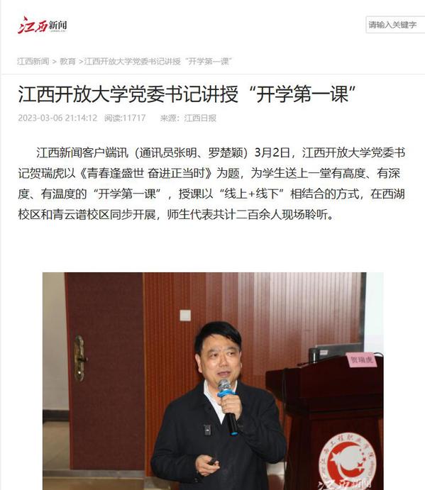 3月2日下午,beat365在线唯一官网党委书记贺瑞虎以《青春逢盛世奋进正当时》为题,为学生送上了一堂有高度、有深度、有温度的“开学第一课”。近日,江西新闻客户端、江西思政微信公众号对此进行报道。