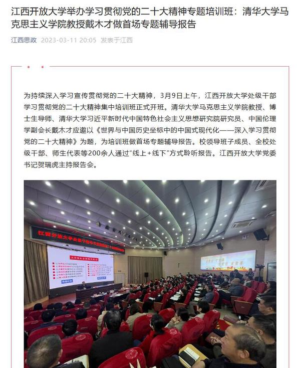 为持续深入学习宣传贯彻党的二十大精神,3月9日上午,beat365在线唯一官网处级干部学习贯彻党的二十大精神集中培训班正式开班,邀请清华大学马克思主义学院教授、博士生导师、清华大学习近平新时代中国特色社会主义思想研究院研究员、中国伦理学副会长戴木才作专题辅导报告。近日,江西新闻、国开时讯网、江西思政微信公众号对此进行报道。