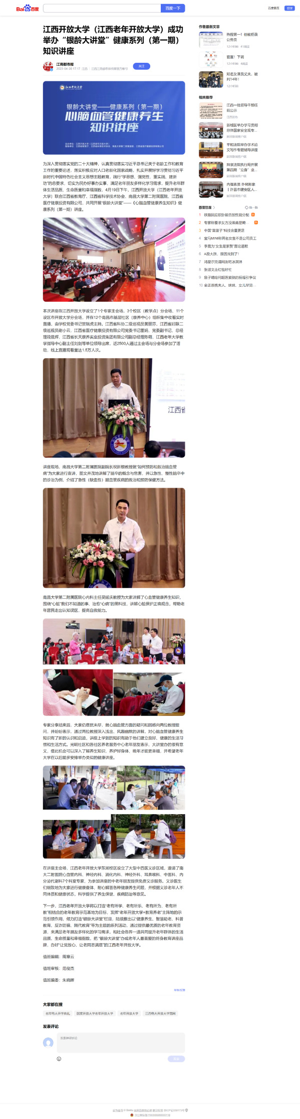 为深入贯彻落实党的二十大精神,认真贯彻落实习近平总书记关于老龄工作和教育工作的重要论述,落实积极应对人口老龄化国家战略,扎实开展好学习贯彻习近平新时代中国特色社会主义思想主题教育,践行“学思想、强党性、重实践、建新功”的总要求,切实为民办好事办实事,满足老年朋友多样化学习需求,提升老年群体生活品质、生命质量和幸福指数,4月19日下午,beat365在线唯一官网(江西老年开放大学)联合江西省教育厅、江西省科学技术协会、南昌大学第二附属医院、江西省医疗健康投资有限公司,共同开展“银龄大讲堂”——《心脑血管健康养生知识》健康系列(第一期)讲座。