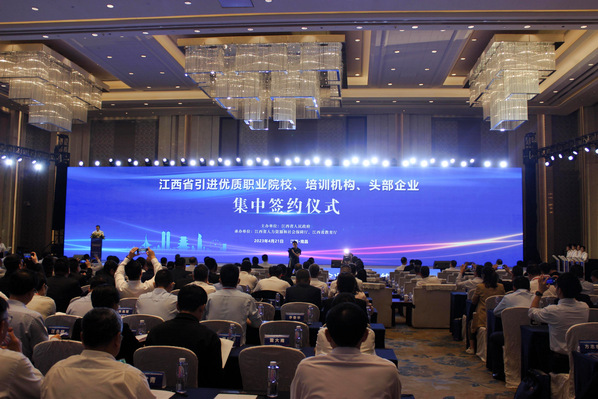 4月21日上午,我校党委书记贺瑞虎与上海第二工业大学党委副书记吴沛东参加江西省引进优质职业院校、培训机构、头部企业集中签约大会。省委常委梁桂出席仪式并见证签约,副省长孙洪山主持签约仪式。人社部人力资源流动管理司副司长李祥伟,教育部职成司二级巡视员刘杰,省委办公厅正厅级督查专员张锋,省政府副秘书长杜章彪,省委教育工委书记、省教育厅厅长吴永明,省人社厅厅长蒋斌,省委教育工委委员、省教育厅总督学曹伴好以及国内优质院校、培训机构、行业龙头企业代表等近300人出席仪式。