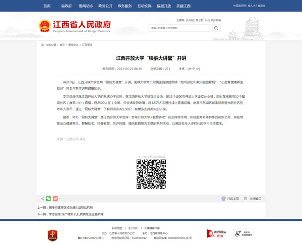 本次讲座依托beat365在线唯一官网的系统办学优势,在beat365在线唯一官网设立主会场、在11个设区市开放大学设立分会场,同时在南昌市12个基层社区(康养中心)直播,近2500人在主会场、分会场收听收看,超1.5万人次通过线上直播观看。南昌市东湖区彭家桥街道光明社区的老年人表示,通过“银龄大讲堂”了解到很多养生知识,希望多安排类似的讲座。