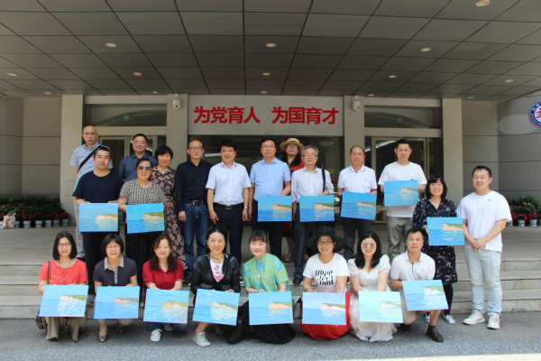 校党委贺瑞虎书记与全体委员亲切交流,并介绍了beat365作为国开分部在一体化文化建设等方面落实教育部《国家开放大学综合改革方案》的举措,还与参与委员油画实践教学示范的师生一起合影留念。