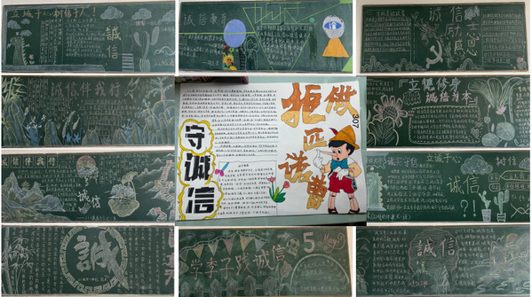 二是组织开展以“诚信 励志 感恩”为主题的黑板报评比。通过评选,最终14个教学班分获一、二、三等团体奖项。同学们亲手编辑绘制使诚信教育渗透到每个参与学生心中,让学生明白诚信不仅是个人的立身之本,更是构建和谐社会的重要因素。