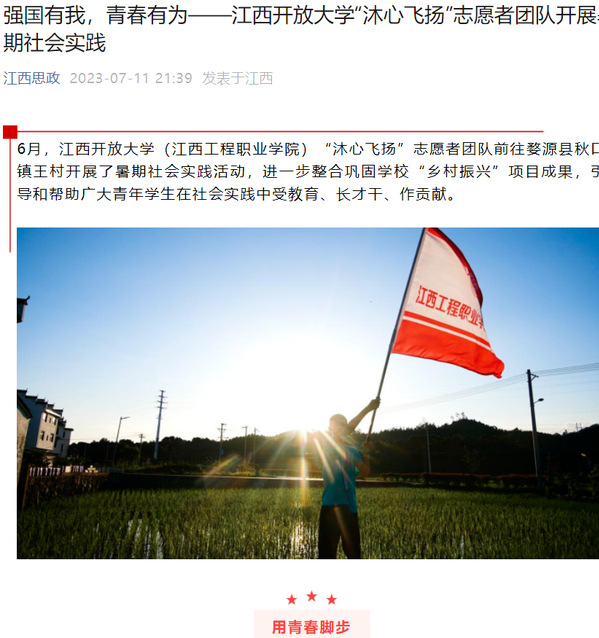 6月,beat365在线唯一官网(江西工程职业学院)“沐心飞扬”志愿者团队前往婺源县秋口镇王村开展了暑期社会实践活动,进一步整合巩固学校“乡村振兴”项目成果,引导和帮助广大青年学生在社会实践中受教育、长才干、作贡献。
