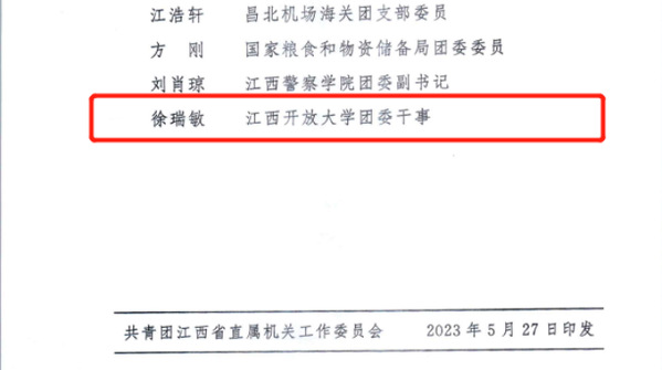 日前,共青团江西省直属机关工作委员会下发了《关于表彰2022年度省直机关先进团青组织优秀团员青年、优秀团青干部的通报》,beat365智能技术学院2021级数控技术专业学生邓浩获评“省直机关优秀团员青年”、beat365团委干事徐瑞敏老师获评“省直机关优秀团青干部”。