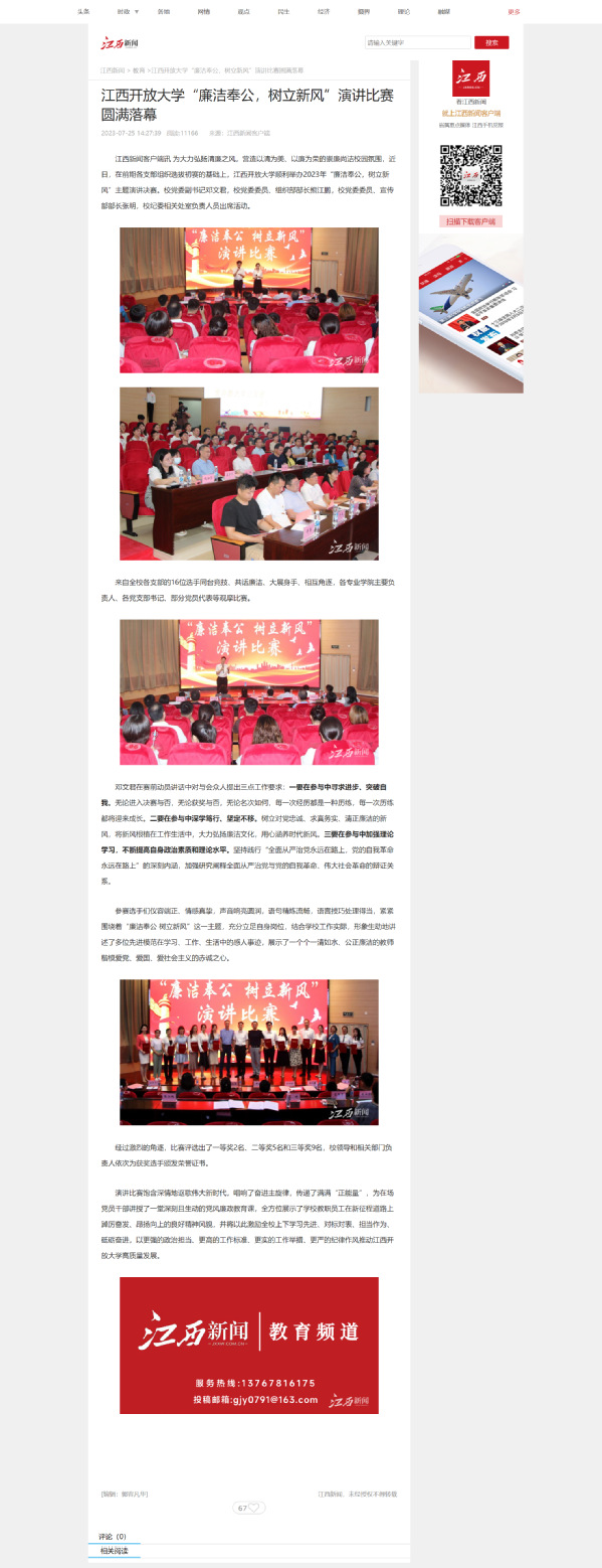 江西新闻客户端讯 为大力弘扬清廉之风,营造以清为美、以廉为荣的崇廉尚洁校园氛围,近日,在前期各支部组织选拔初赛的基础上,beat365在线唯一官网顺利举办2023年“廉洁奉公,树立新风”主题演讲决赛。校党委副书记邓文君,校党委委员、组织部部长熊江鹏,校党委委员、宣传部部长张明,校纪委相关处室负责人员出席活动。