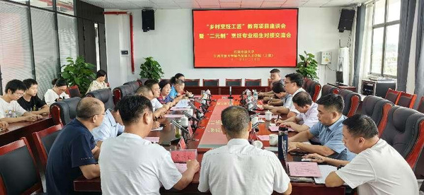 27日下午,黄平槐主持“乡村烹饪工匠”教育项目座谈会暨“二元制”烹饪工艺与营养专业招生对接交流会。教育部挂职干部、上犹县委常委、副县长段奕出席会议。赣州开放大学,学校城乡发展学院、继续教育学院、龙南开放学院(龙南新兴产业人才学院)、上犹开放学院(上犹绿色发展人才学院)等单位有关同志及学校“二元制”烹饪工艺与艺术专业2022级学生代表、上犹中专烹饪专业学生代表共20余人参加会议。会议围绕“乡村烹饪工匠”教育项目的可行性进行深度会谈,并对上犹绿色发展人才学院、龙南新兴产业人才学院即将试点的电商素质提升项目、乡村旅游导游助力项目、与当地中专技校的其它合作项目进行论证。