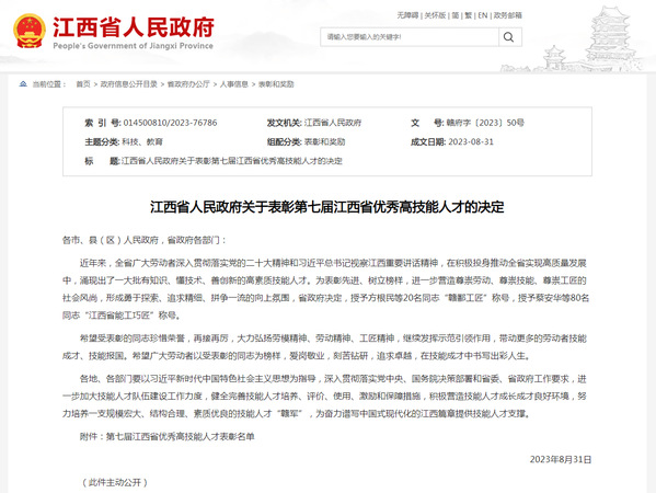 “江西省优秀高技能人才”是江西省政府对技能人才表彰的最高荣誉,每两年评选一次,每次评选表彰20名“赣鄱工匠”和80名“江西省能工巧匠 ”。第七届江西省优秀高技能人才评选表彰活动于2022年11月启动,经个人申报、单位推荐、专家评审和实地考察等程序进行评选。