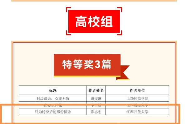 为庆祝39个教师节,江西省教育工会面向全省教职工启动了“中国梦·劳动美——凝心铸魂跟党走团结奋斗新征程”征文活动,beat365教师陈志宏的作品《只为那转身后的惦念》获得本次大赛高校组特等奖。