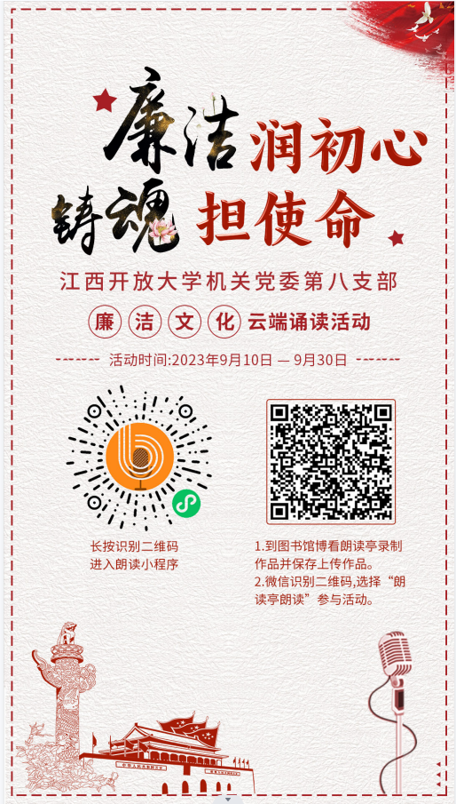 同时,为进一步弘扬党的光荣传统和优良作风,用廉洁文化滋养身心,用伟大建党精神滋养党性修养,八支部正式启动开展廉洁文化云端诵读活动。通过“云端诵读”习近平总书记关于廉洁文化建设的重要论述和古今文学作品中关于廉洁文化的经典篇章,让广大党员同志更加坚定理想信念,不断提高政治判断力、政治领悟力、政治执行力,引导党员干部增强纪律意识、规矩意识,广泛推动廉洁文化融入干部思想作风建设、融入师德师风建设、校园文化建设。