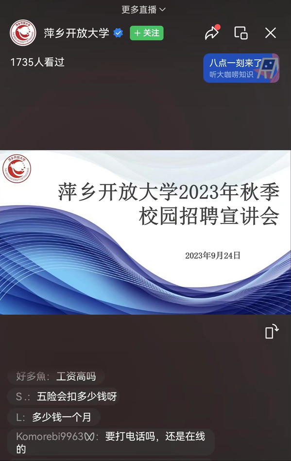 为帮助未就业的成人学生能够有更好的就业指导和服务,9月24日,萍乡开放大学开展2023年秋季校园招聘宣讲会。宣讲会以视频直播的方式进行。