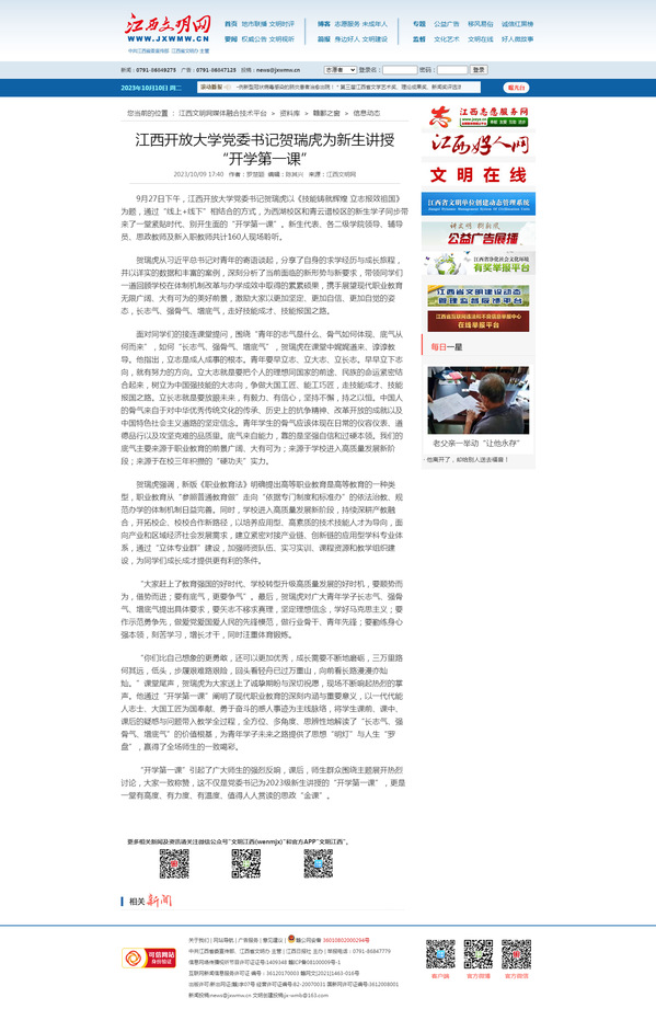9月27日下午,beat365在线唯一官网党委书记贺瑞虎以《技能铸就辉煌 立志报效祖国》为题,通过“线上+线下”相结合的方式,为西湖校区和青云谱校区的新生学子同步带来了一堂紧贴时代、别开生面的“开学第一课”。新生代表、各二级学院领导、辅导员、思政教师及新入职教师共计160人现场聆听。