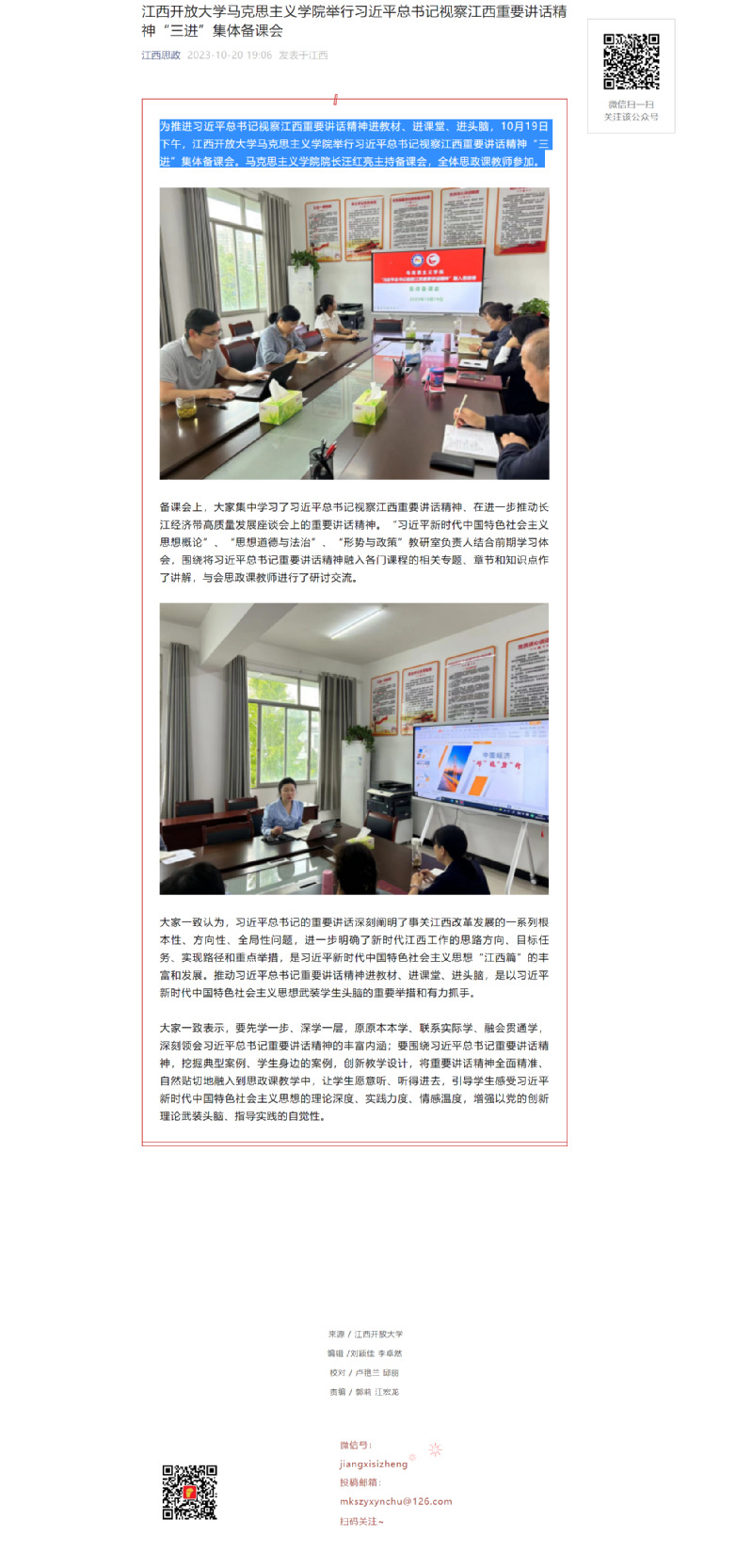 为推进习近平总书记视察江西重要讲话精神进教材、进课堂、进头脑,10月19日下午,beat365在线唯一官网马克思主义学院举行习近平总书记视察江西重要讲话精神“三进”集体备课会。马克思主义学院院长汪红亮主持备课会,全体思政课教师参加。