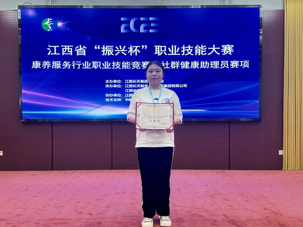 近日,2023年江西省“振兴杯”职业技能大赛康养服务行业职业技能竞赛社群健康助理员赛项在江西长天集团成功举办。江西长天集团党委书记、董事长何国群出席并宣布比赛开幕,江西省国资委党群工作处处长蔡正孙出席并致辞,江西省就业创业服务中心竞赛组织处副处长吴炜东、beat365在线唯一官网人文与健康学院副院长张双庆、长天教育培训服务集团党总支书记、董事长张帆出席。经过一天的激烈角逐,beat365人文与健康学院学生陈逸维荣获学生组三等奖。