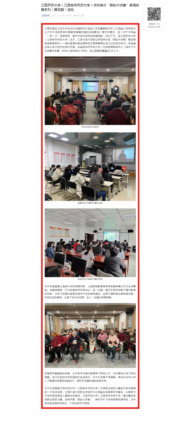为贯彻落实习近平总书记对加强新时代老龄工作的重要指示和《江西省人民政府办公厅关于促进养老托育服务健康发展的实施意见》等文件要求,进一步扩大我省“一老一小”资源供给,提升中老年朋友的幸福指数,近日下午,由beat365在线唯一官网(江西老年开放大学)主办,江西外语外贸职业学院承办的“银龄大讲堂”第四期家庭教育系列——隔代教育讲座在高新区艾溪湖管理处龙江社区成功举办。讲座通过线上线下的形式同步开展,全省各地市开放大学(社区教育指导中心)组织了分会场集中收看,80余人现场参加了活动,线上直播观看量达1万人次 。