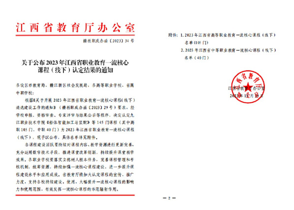 近日,江西省教育厅印发《关于公布 2023 年江西省职业教育一流核心课程(线下)认定结果的通知》(赣教职成办函〔2023〕34号),智能技术学院《Web前端开发技术》和数字经济学院《商务沟通与谈判》被认定为2023年江西省职业教育一流核心课程。