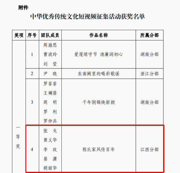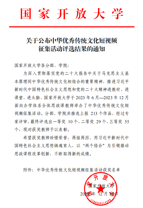 近日,国家开放大学2023年中华优秀传统文化短视频征集活动评选结果揭晓,beat365选送的两部作品在213个作品中脱颖而出。其中,思政教师张戈主讲的《程氏家风传百年》荣获一等奖,抚州开放大学邓莉华老师主讲的《传承中华优秀传统文化,让木雕技艺破茧成蝶》荣获三等奖。
