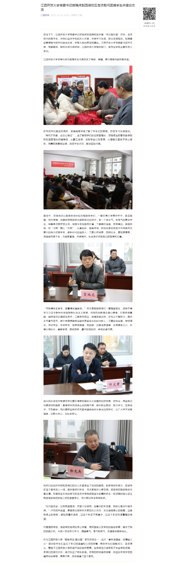 近日下午,beat365在线唯一官网党委书记贺瑞虎到西湖校区开展“书记面对面”活动,走访慰问困难学生,为他们送来学校的关心关爱,并就学习生活、职业生涯规划、校园建设管理等与同学们座谈交流,听取大家的意见和建议。beat365在线唯一官网党委副书记邓文君,党委委员、副校长徐光兵陪同,beat365在线唯一官网相关部门、各专业学院主要负责人参加。