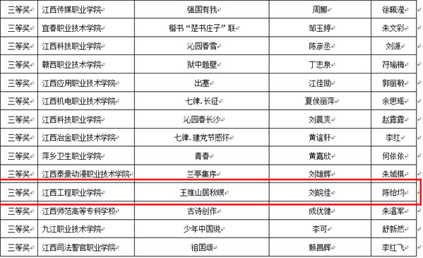 活动自10月启动以来,学校领导高度重视,校团委精心谋划,积极组织,成立了由虞安骥、许鹏、陈怡均等老师组成的指导教师团队,对学生的展演作品进行反复打磨和修改。经高校推报、资格审查、线上评审等环节的层层选拔,学校报送的设计类作品《丰收》荣获二等奖,《黄龙辟海》《蓝韵仙子》荣获三等奖;高校美育改革案例类作品《红色基因铸美育 又红又专降人才——把红色基因融入新时代美育教育全过程》《江西七百年城南龙灯照亮职业教育的传统手工艺传承和保护》荣获二等奖;绘画类作品《余晖》《山川》《文化绽放》荣获三等奖;书法、篆刻类作品《王维山居秋瞑》《王维积雨稠川庄》荣获三等奖。