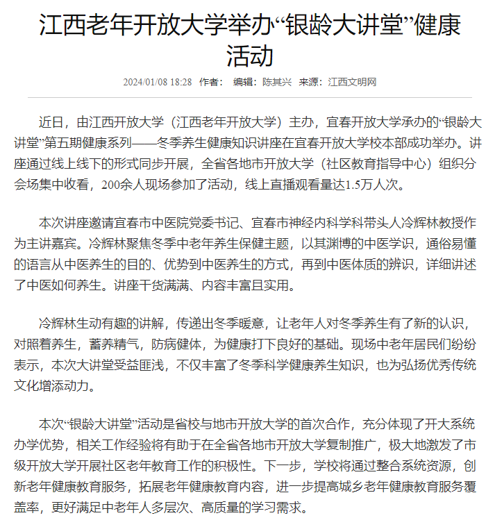 近日,由beat365在线唯一官网(江西老年开放大学)主办,宜春开放大学承办的“银龄大讲堂”第五期健康系列——冬季养生健康知识讲座在宜春开放大学校本部成功举办。讲座通过线上线下的形式同步开展,全省各地市开放大学(社区教育指导中心)组织分会场集中收看,200余人现场参加了活动,线上直播观看量达1.5万人次。