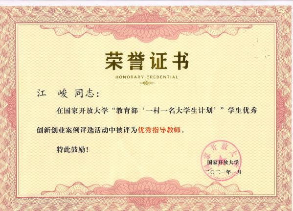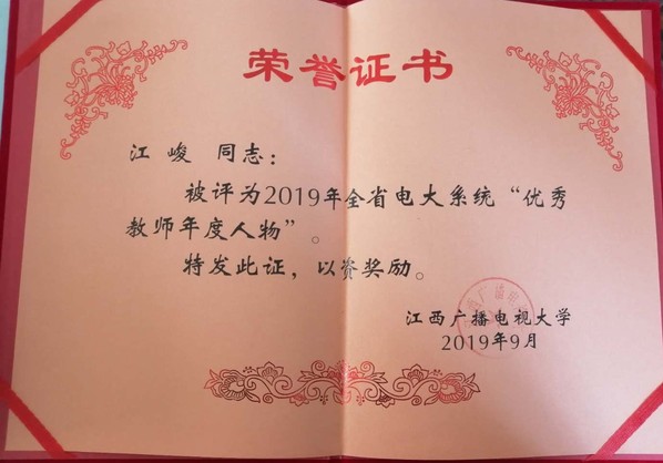 江峻,中小学高级教师,乐平市开放学院院长。2011年至今,担任乐平市电大教学点开放教育班主任,2012-2021年担任“一村一名大学生工程”班主任。他忠诚党的教育事业,热爱教育教学工作,2014年至2018年期间,连续荣获乐平市“优秀教师”荣誉称号,是2015年、2018年全省电大系统“优秀教务工作者”,2017年、2019年全省电大系统“优秀教师年度人物”。2019年荣获国家开放大学 “优秀班主任”称号,2021年又被国家开放大学评为“教育部'一村一名大学生计划'学生优秀创新创业案例优秀指导教师”。