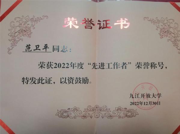 范卫平,九江开放大学办公室副主任。从一名普通教师到身兼数职,他始终抱着对党的教育事业的无限忠诚,怀着对本职工作的热爱和对学生的责任心,时刻坚持“以学生为中心”的理念,始终勤勤恳恳、兢兢业业,在平凡的岗位上做出了不平凡的业绩。